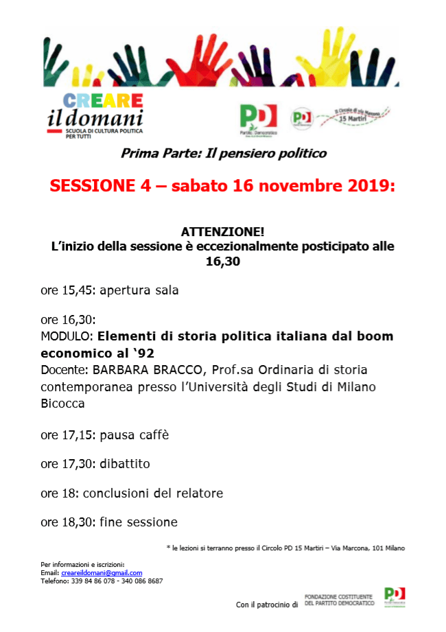 Confermiamo l’appuntamento con la quarta sessione di Creare il Domani di sabato 16 novembre presso il circolo PD 15 Martiri, in via Marcona, 101 Milano.