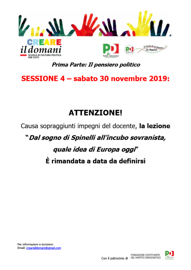 vi avvisiamo che, a causa di sopraggiunti impegni de docente, la lezione “Dal sogno di Spinelli all’incubo sovranista, quale idea di Europa oggi” è rimandata a data da definirsi.