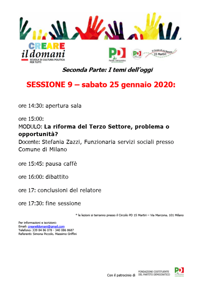 Confermiamo l’appuntamento con la quarta sessione di Creare il Domani di sabato 25 gennaio presso il circolo PD 15 Martiri, in via Marcona, 101 Milano.