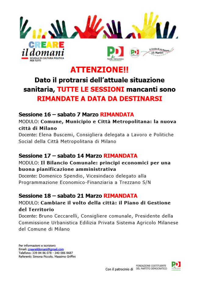 Dato il protrarsi dell’attuale situazione sanitaria, TUTTE LE SESSIONI mancanti di “Creare il domani” sono RIMANDATE A DATA DA DESTINARSI