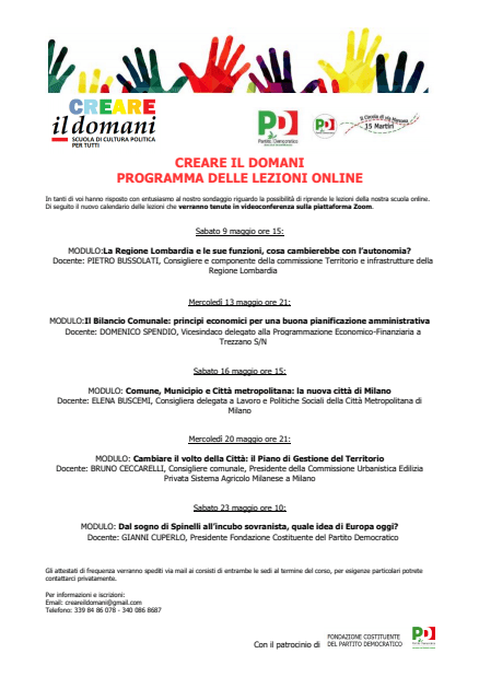 Tutte le lezioni saranno realizzate in videoconferenza su ZOOM: nei giorni precedenti la lezioni agli iscritti sarà fornito il link per poter accedere alla videoconferenza