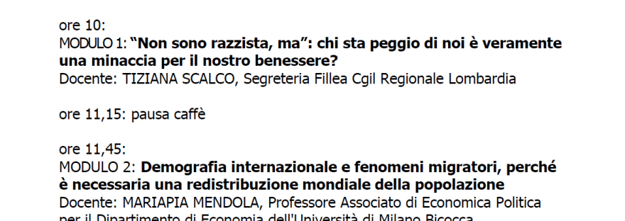 Carissimi iscritti, Confermiamo l'appuntamento di sabato 26 gennaio presso il Centro Civico Pasolini, in largo Nenni, 2 Opera. La lezione di sabato ha come tema il razzismo causato dalla paura di perdere benessere e la necessità di favorire fenomeni migratori internazionali. Ne parleremo con Tiziana Scalco e Mariapia Mendola. (al link biografie e bibliografie trovate i profili dei docenti… Continua a leggere Edizione 1 / Sessione 7 (Scalco – Razzismo / Mendola – Migrazioni internazionali) – Sabato 26 Gennaio