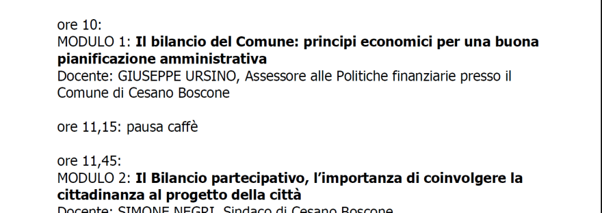 Carissimi iscritti, Confermiamo l'appuntamento di sabato 9 febbraio presso il Centro Civico Pasolini, in largo Nenni, 2 Opera. Conclusa la seconda parte sull'attualità politica nazionale e internazionale, iniziamo quella dedicata ai principi di amministrazione locale. La lezione di sabato ha come tema il bilancio e la partecipazione, ne discuteremo con Giuseppe Ursino e Simone Negri.… Continua a leggere Edizione 1 / Sessione 8 (Ursino – Bilancio comunale / Negri – Partecipazione cittadina) – Sabato 9 Febbraio