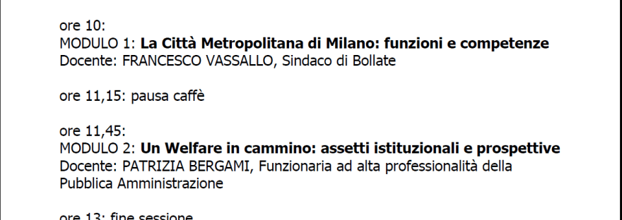 Carissimi iscritti, Confermiamo l’appuntamento di sabato 23 febbraio presso il Centro Civico Pasolini, in largo Nenni, 2 Opera. La lezione di sabato ha come tema il welfare locale e la Città Metropolitana, ne discuteremo con Patrizia Bergami e Francesco Vassallo. (al link biografie e bibliografie trovate i profili dei docenti ed eventuali bibliografie). Vi aspettiamo a partire dalle… Continua a leggere Edizione 1 / Sessione 9 (Vassallo – Città metropolitana / Bergami – Welfare locale) – Sabato 23 Febbraio